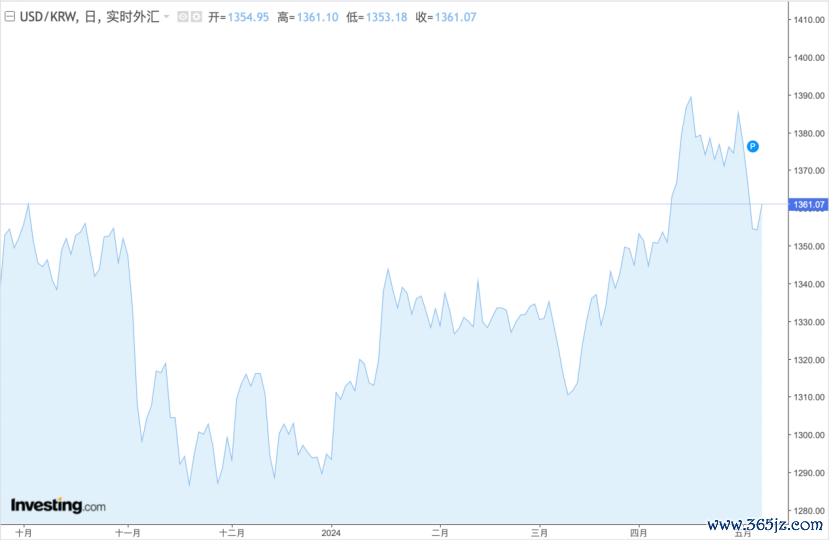 在韩国当局的出手干预之下,4月下旬,韩元兑美元汇率悄悄收复1400整数关口,截至5月7日,韩元兑美元汇率徘徊在1360附近。