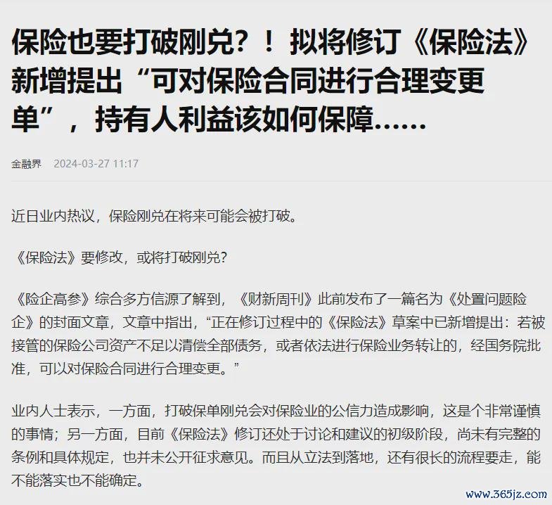 前段时间,财新曾报道说,有关方面已经在考虑修订保险法,打破寿险的刚性兑付。在保险法中加入这样的条款:“若被接管的保险公司资产不足以清偿全部债务,或者依法进行保险业务转让的,经国务院批准,可以对保险合同进行合理变更”。