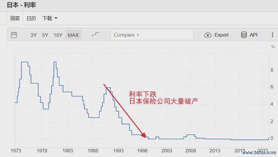 上世纪90年代,日本从高利率时代滑落到低利率时代的过程中,有大量保险公司破产,原因是之前产品的预定利率太高,以10-20年期产品为例,1985~1989年产品预定利率达6%。